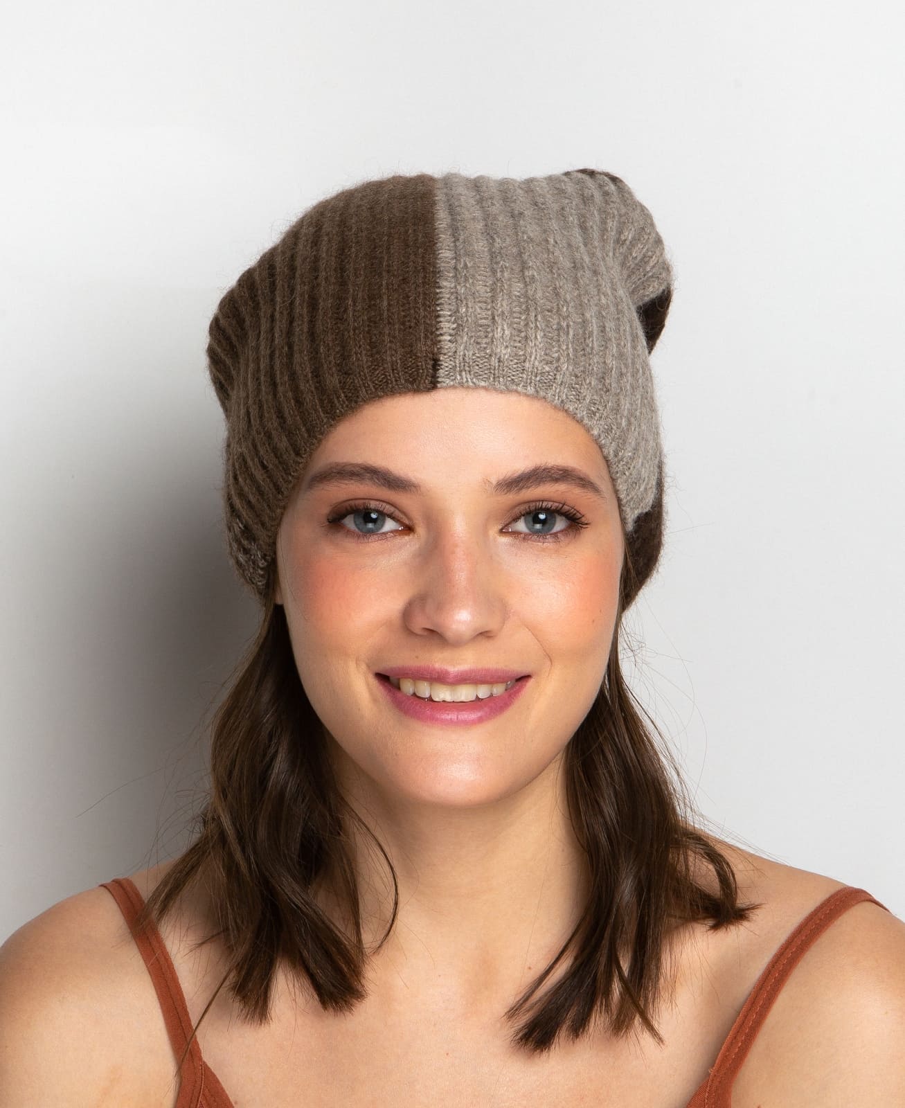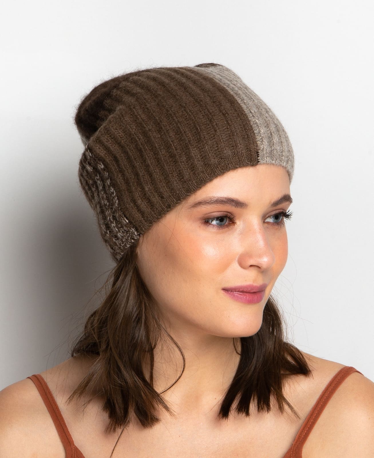 Уникальный двухцветный дизайн, выполненный в сочетании коричневого и серого оттенков, придает шапке современный и стильный вид. Эта шапка станет ярким акцентом вашего образа, легко дополняя как повседневные, так и более нарядные наряды. Простота ухода делает эту шапку еще более привлекательной: ручная стирка при низких температурах сохранит мягкость и форму изделия на долгие годы.
