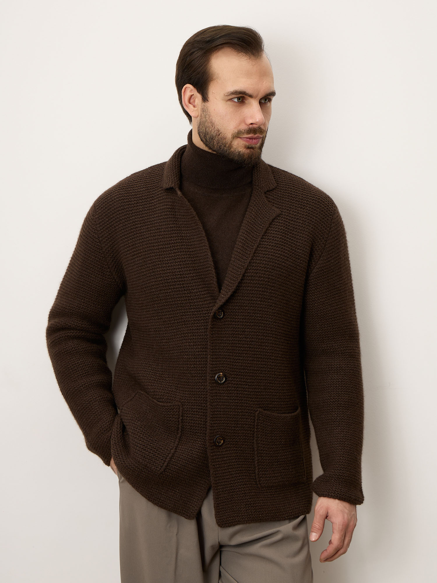 • Стильный мужской кардиган с классическими лацканами, создающий образ жакета, но с комфортом трикотажа.