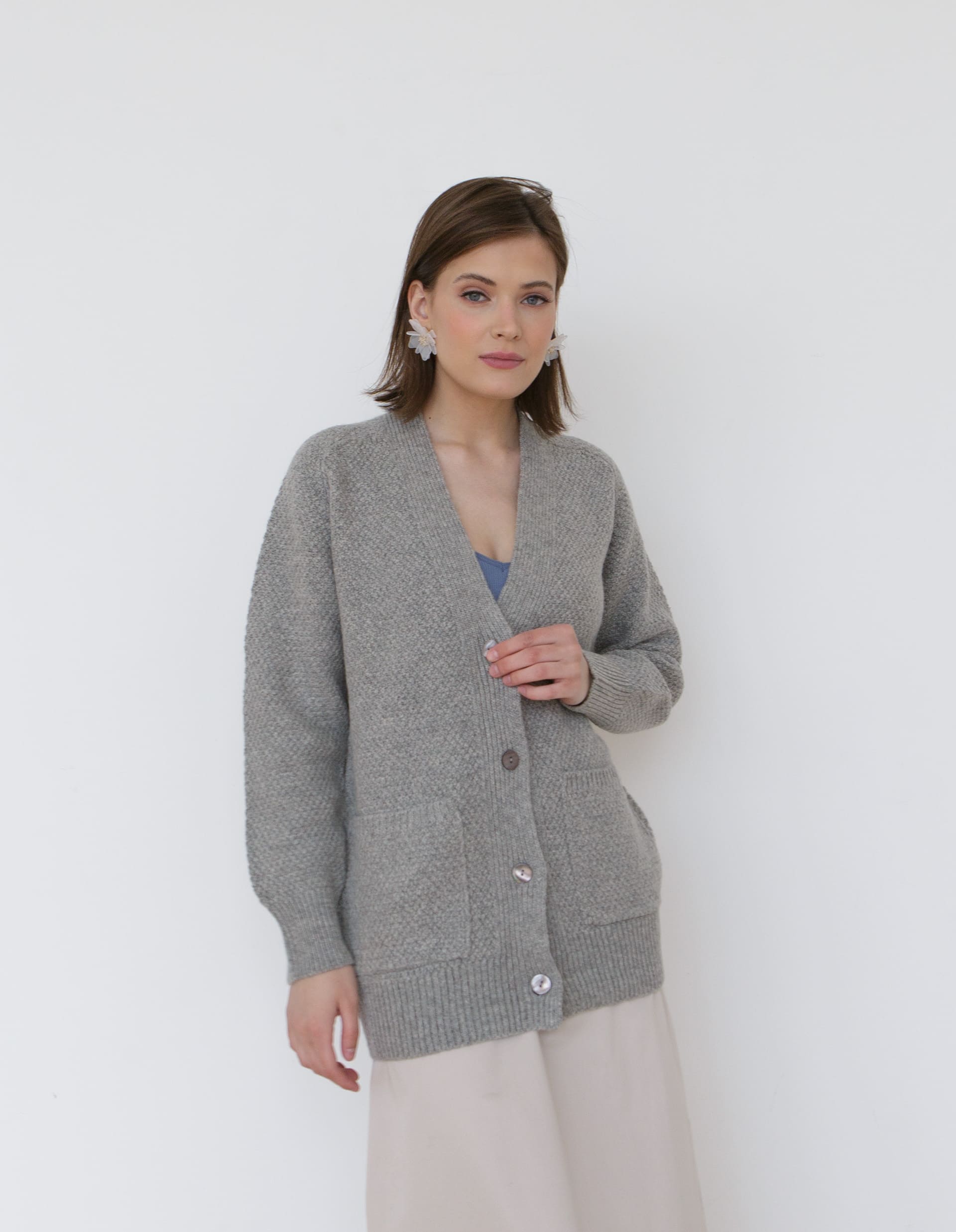 Модель выполнена в формате классического кардигана с V-образным вырезом и застёжкой на пуговицы. Универсальный крой позволяет носить изделие как самостоятельный элемент или как дополнительный слой в образе.