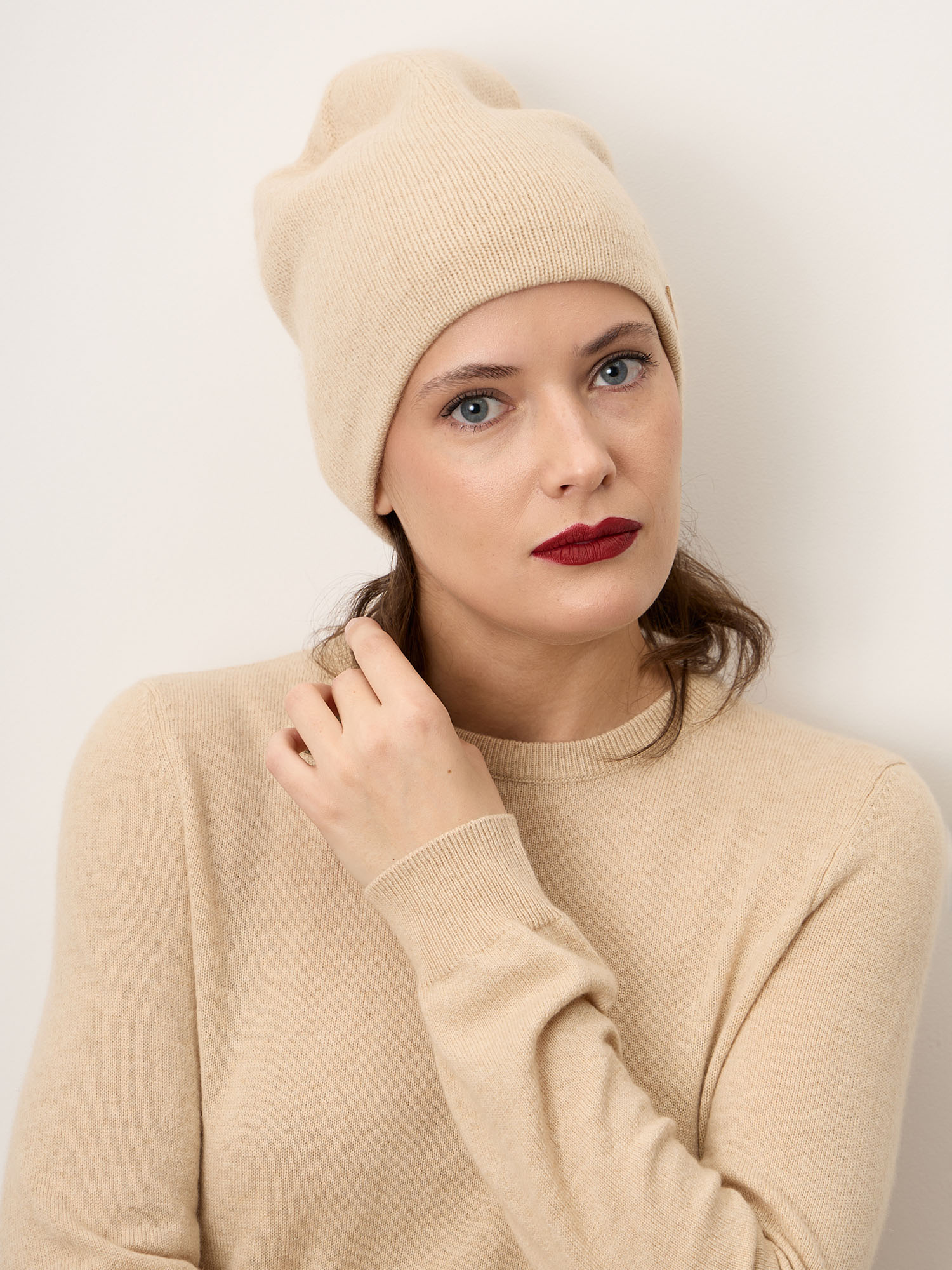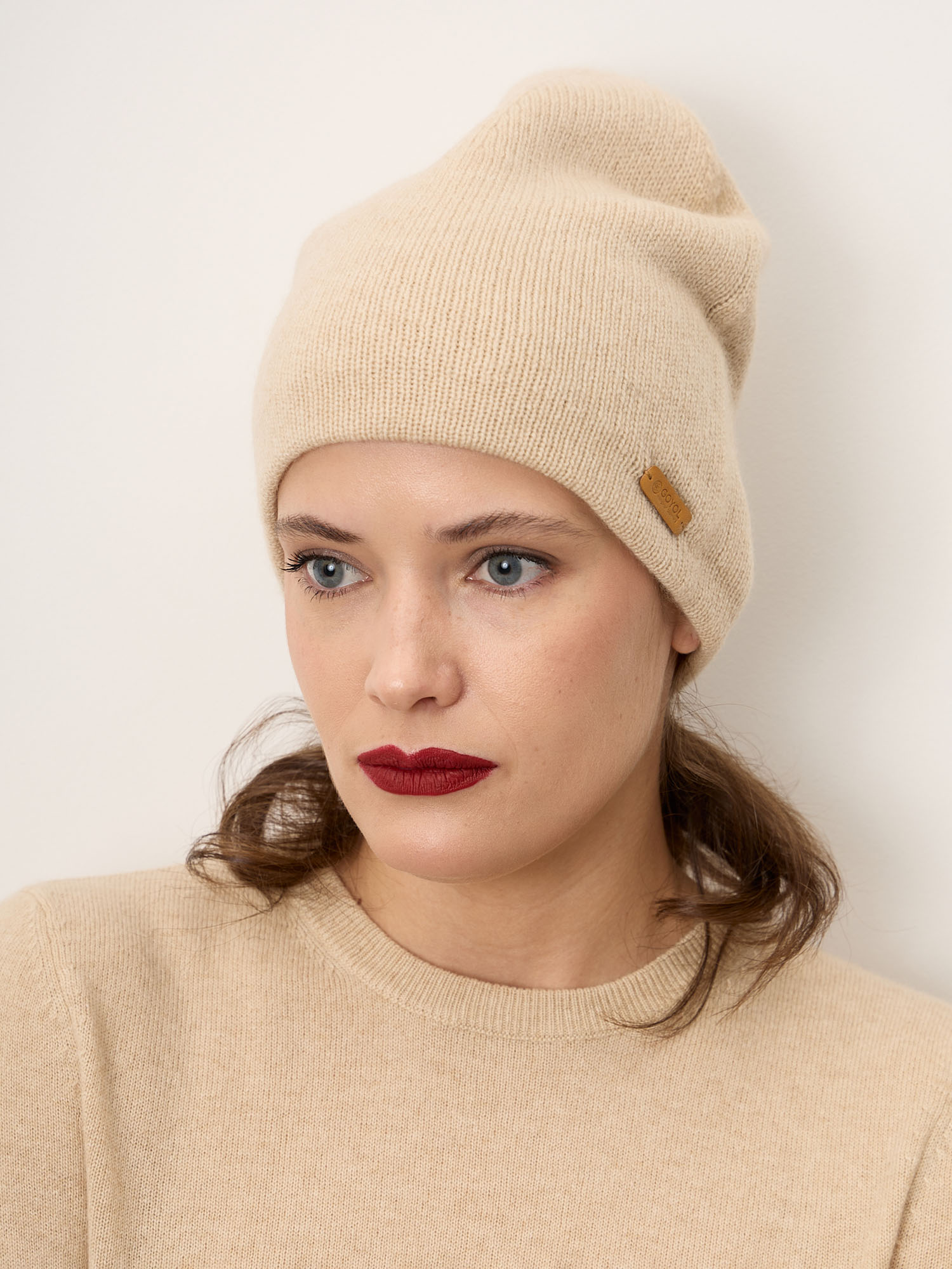 Эта шапка создана для тех, кто ценит деликатное тепло и ненавязчивую элегантность. Настоящий монгольский кашемир мягко обнимает голову, создавая ощущение лёгкости и комфорта даже в самые холодные дни. Бежевый оттенок делает аксессуар универсальным и естественным — он подчёркивает природную красоту ткани и легко сочетается с базовым гардеробом.