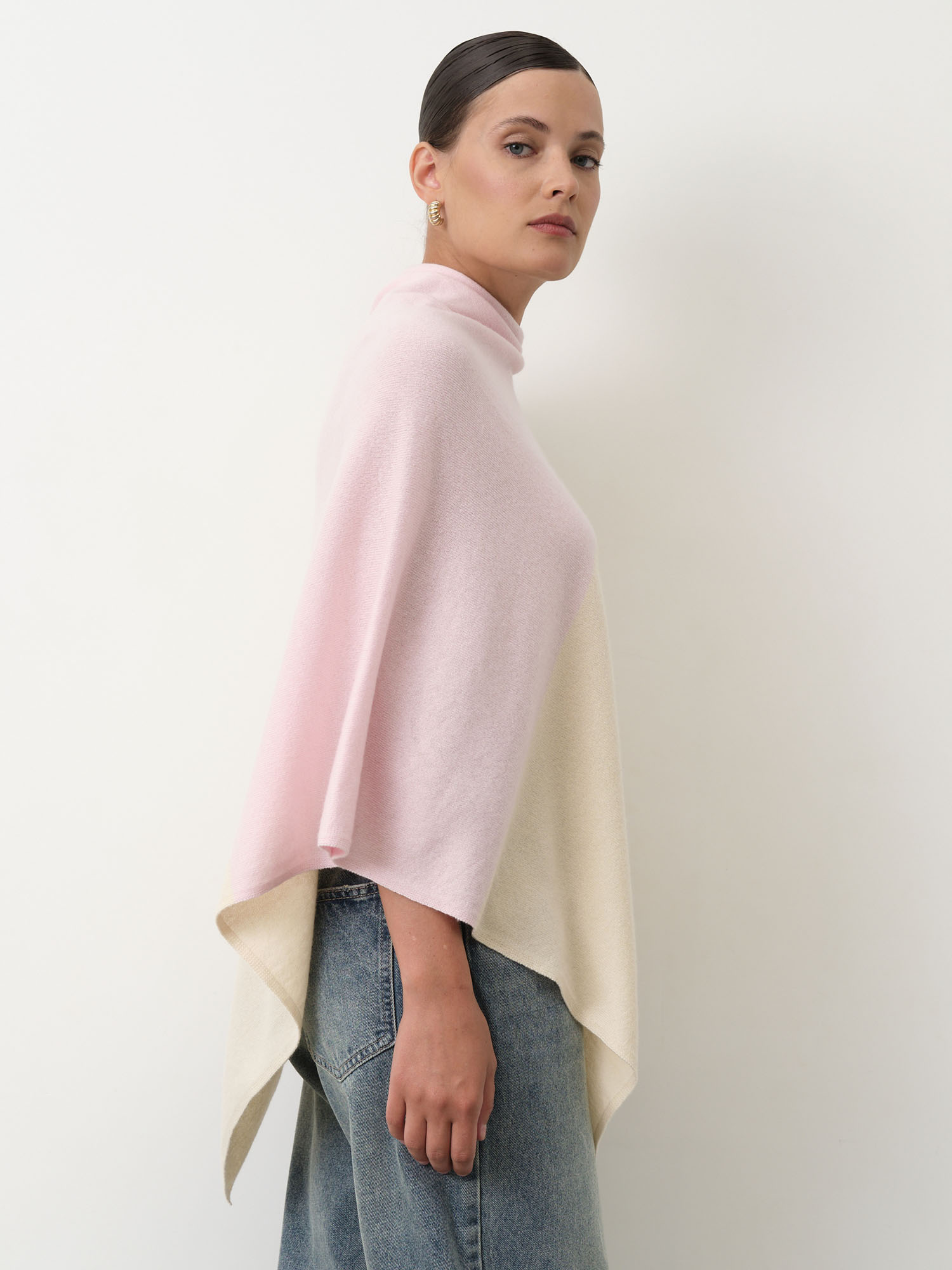 Обожаю это пончо: натуральная шерсть, лёгкость и невероятное тепло. Асимметрия смотрится стильно, а кремово-розовый тон добавляет нежность.