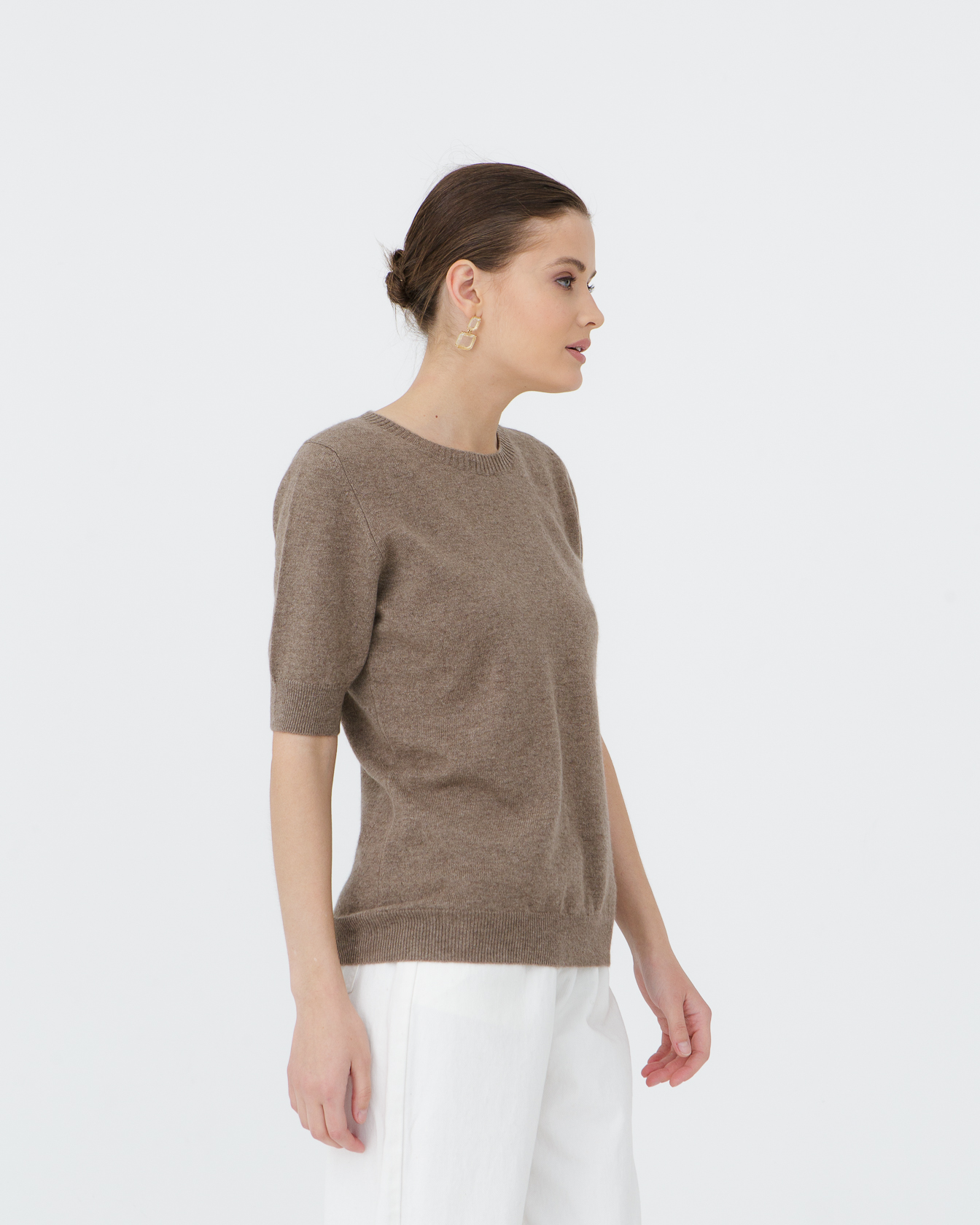 Модель выполнена в минималистичном стиле с круглой горловиной и короткими рукавами. Лаконичный крой подчёркивает универсальность изделия и позволяет легко сочетать его с различными элементами гардероба.