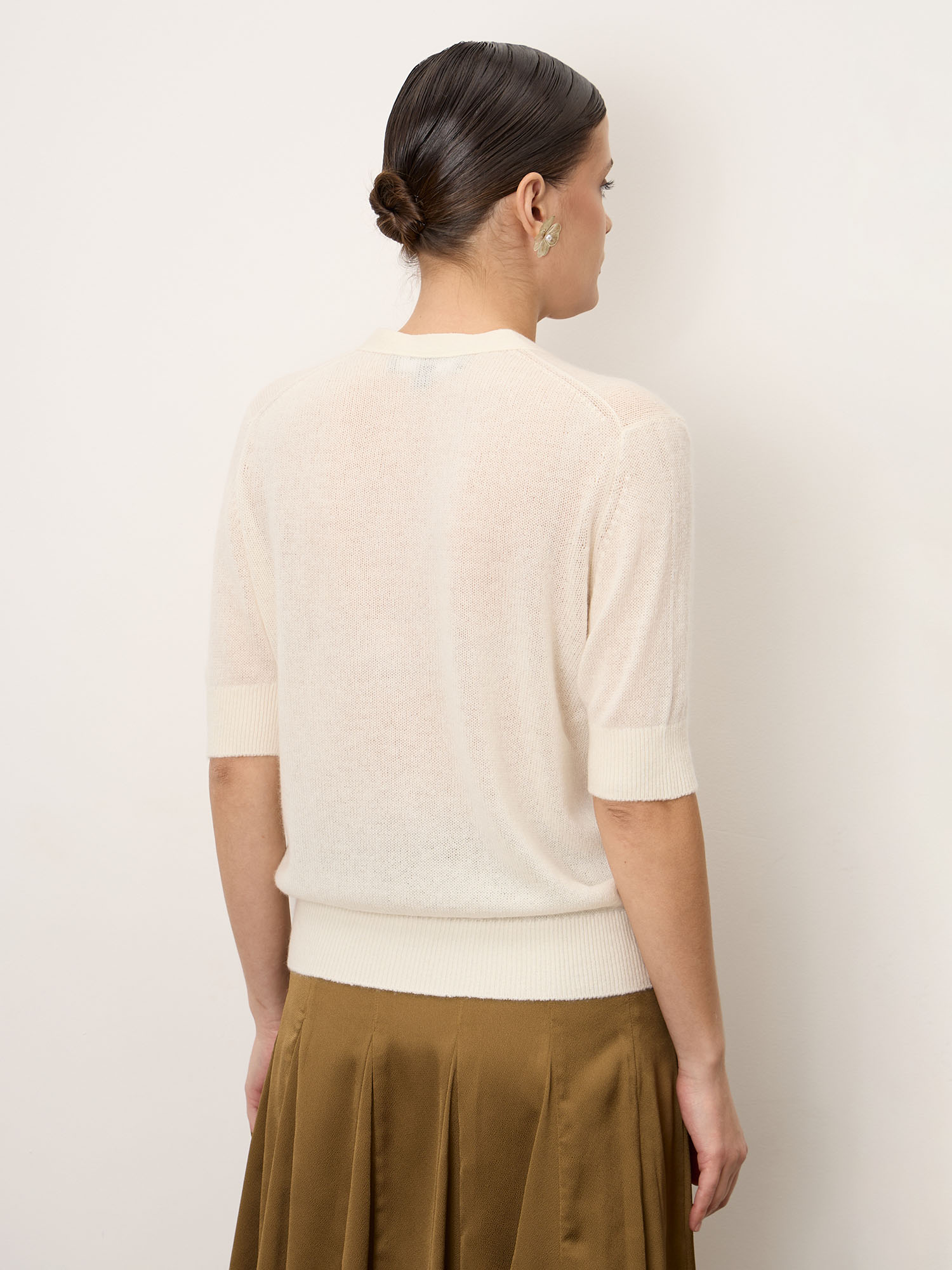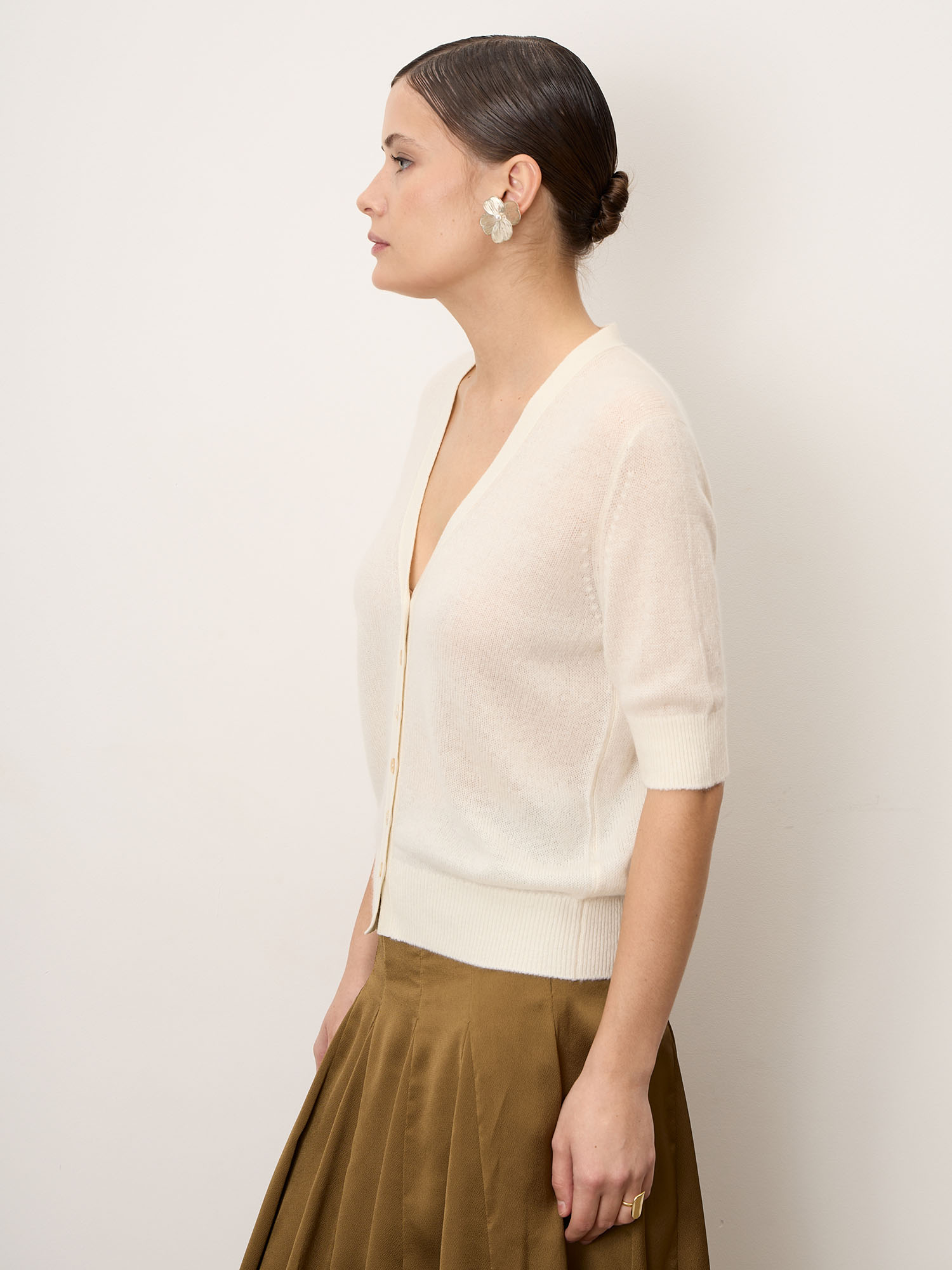 Классический кардиган с V-образным вырезом и застёжкой на пуговицы, короткий рукав, аккуратная вязка и лаконичный силуэт.